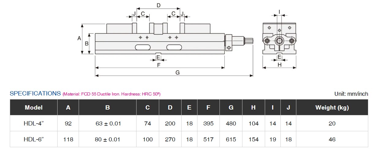 Fabriqué en fonte ductile FCD 55 et trempé à 50° HRC, l'étau HDL résiste aux conditions de coupe tout en garantissant précision et durabilité à long terme. Sa conception compacte et sa hauteur standardisée permettent le montage de plusieurs unités en parallèle, optimisant ainsi l'aménagement de l'espace de travail et améliorant l'efficacité opérationnelle.