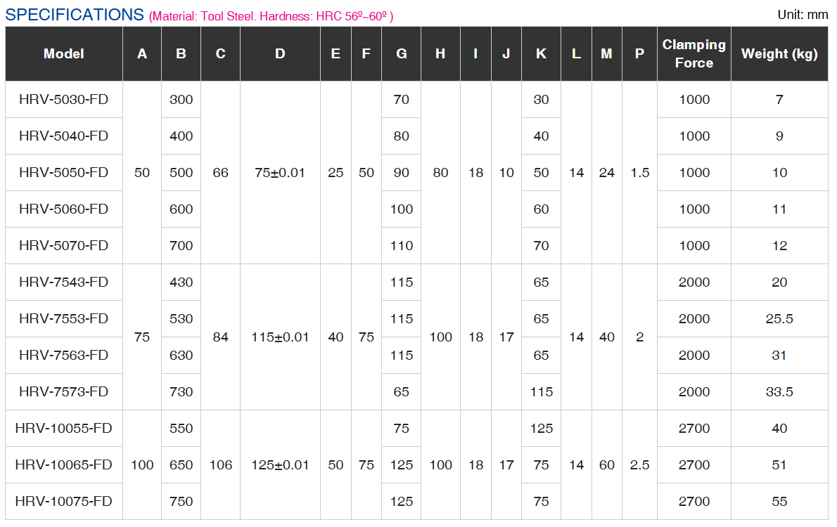 L'étau HRV-Vise In-Row est un étau multiple. Cet étau est fabriqué en acier à outils traité thermiquement (dureté supérieure à 60° HRC), puis usiné avec précision à plusieurs reprises pour une durabilité accrue. Il offre une plage de serrage étendue. Quelle que soit la forme de la pièce (carrée, ronde, cylindrique ou irrégulière), il se positionne rapidement. Le positionnement précis des dents est réglable pour une fixation aisée des pièces.